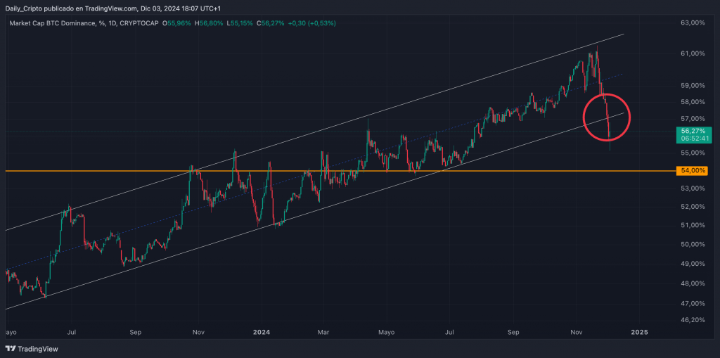 Bitcoin dominance, defined as Bitcoin’s share of the overall cryptocurrency market capitalization, plays a crucial role in signaling altcoin season. A decline in Bitcoin’s dominance indicates that capital is shifting towards altcoins. Currently, Bitcoin dominance has fallen from 61.5% to below 55.27%, a significant shift that historically precedes altcoin rallies. This suggests a broader movement toward altcoins as investor preferences evolve.