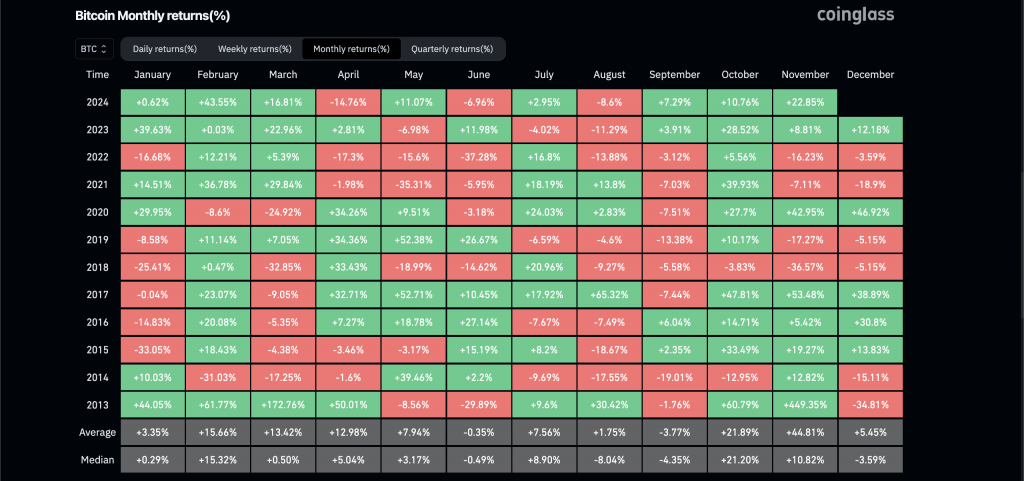 - Historically, November has been Bitcoin’s most profitable month, with an average return of 45%.