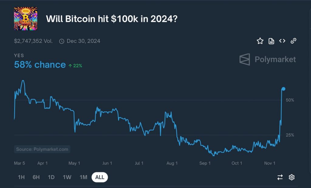 Prediction markets are currently estimating a 59% probability that Bitcoin will reach $100,000 by the end of 2024, driven by significant price movements and institutional interest.