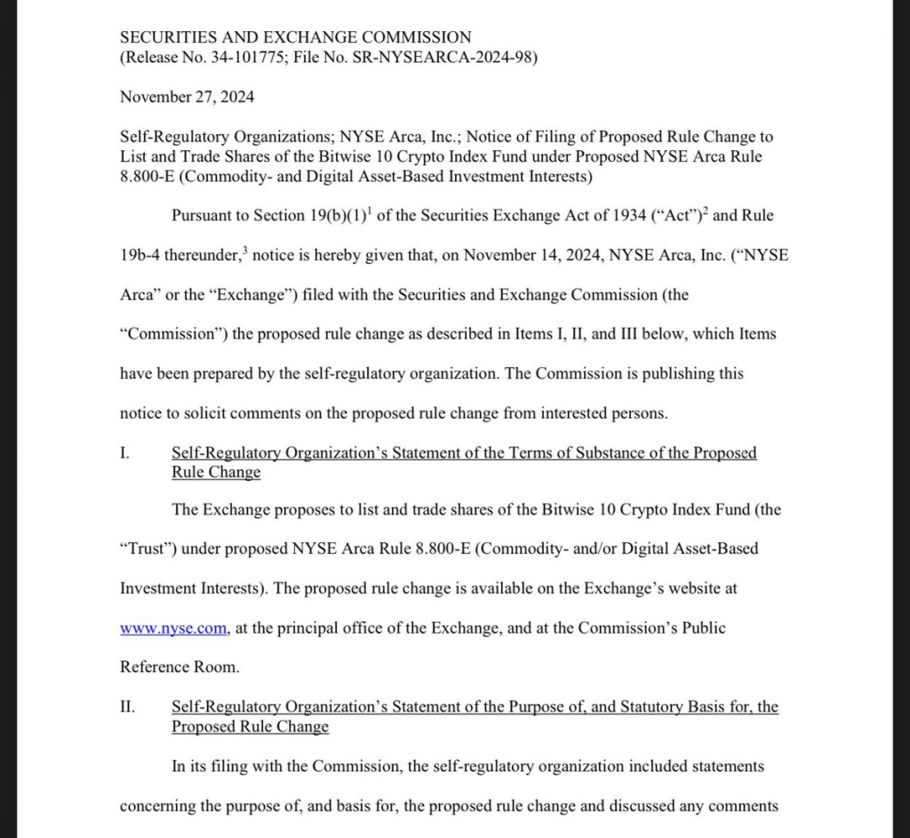 Bitwise Asset Management has taken an important step by getting its proposed listing of its Bitwise 10 Crypto Index Fund as an exchange-traded fund (ETF) on NYSE Arca registered with the U.S. Securities and Exchange Commission (SEC). This filing, submitted on November 15, 2024, suggests a notable evolution for the fund, which has been operational since November 2017. The proposed ETF would offer investors indirect exposure to a diversified range of cryptocurrencies, with a strong emphasis on the two most significant assets: Bitcoin and Ether.