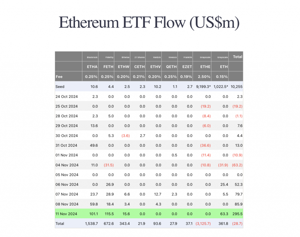 Leading the charge in Monday’s inflows was Fidelity’s ether ETF, which attracted $115.5 million. This was closely followed by BlackRock’s ETHA, which garnered $101.1 million in net inflows. Additional notable contributions came from Grayscale’s Mini Ethereum Trust, which recorded $63.3 million in positive flows (biggest since launch), while Bitwise’s ETHW saw $15.6 million enter the fund. In the four trading days since Donald Trump’s presidential win, spot Ethereum ETFs have collectively accumulated around $513 million in net inflows.