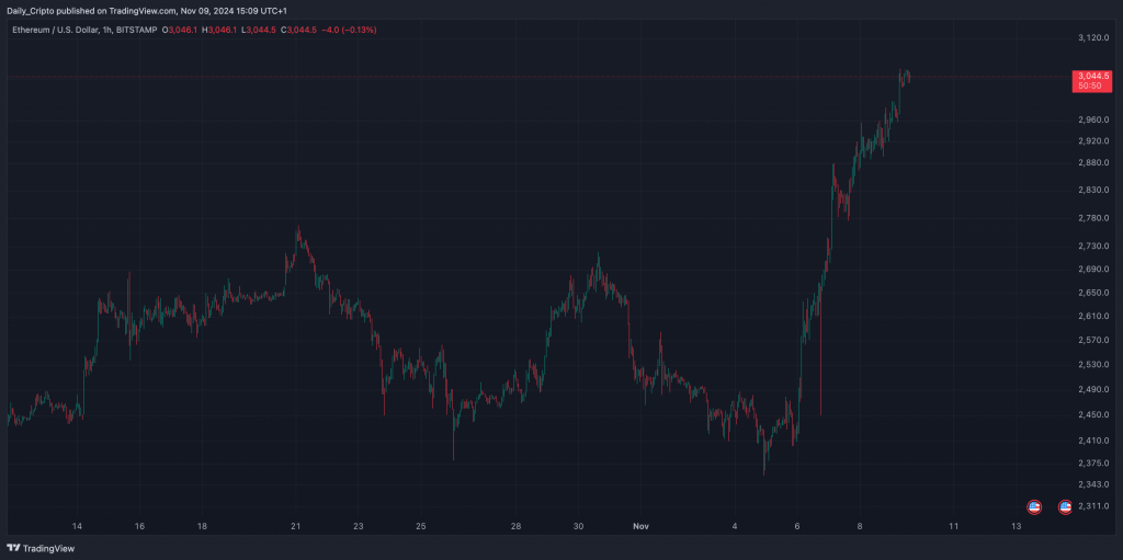 Ethereum has recently reclaimed the significant price level of $3,000, a psychological barrier it had not crossed since August 2. This resurgence comes amid a broader rally in the cryptocurrency market, particularly as Bitcoin has achieved multiple all-time highs, including a record peak of $77,235 on Friday afternoon. The price of Ethereum reached a high of $3,056 early on Saturday, marking its second breach of the $3,000 threshold this year. Notably, just prior to the recent election, Ethereum’s price had dropped to a low of $2,350, illustrating a remarkable recovery.