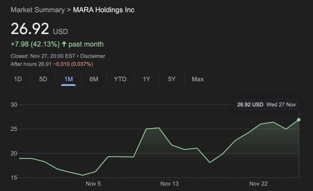 - MARA’s year-to-date yield per share from Bitcoin investments is 36.7%.