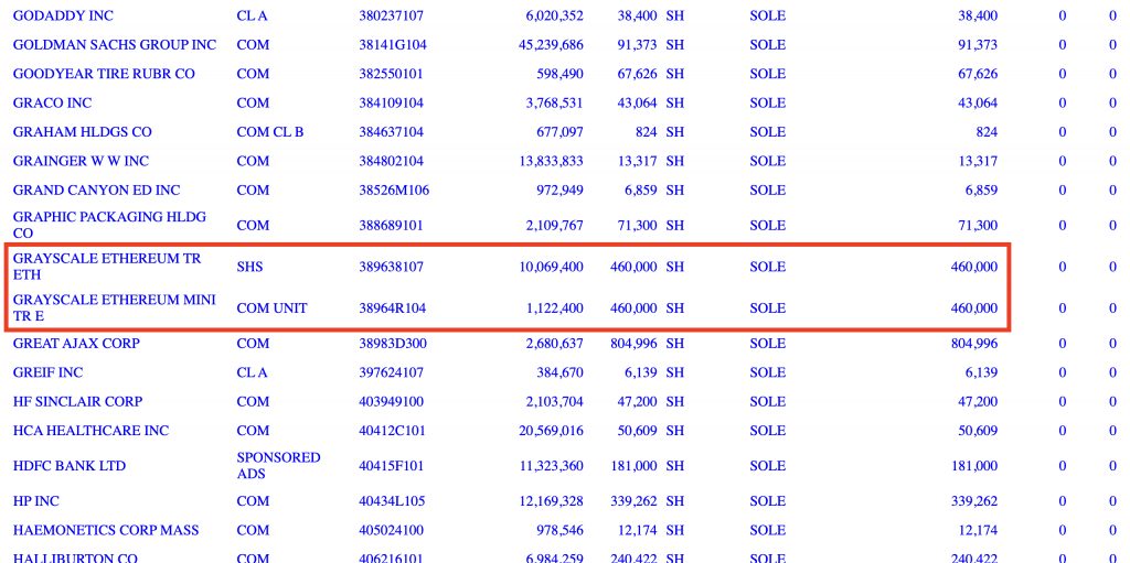 - The fund holds approximately $10 million in Grayscale’s Ethereum Trusts.