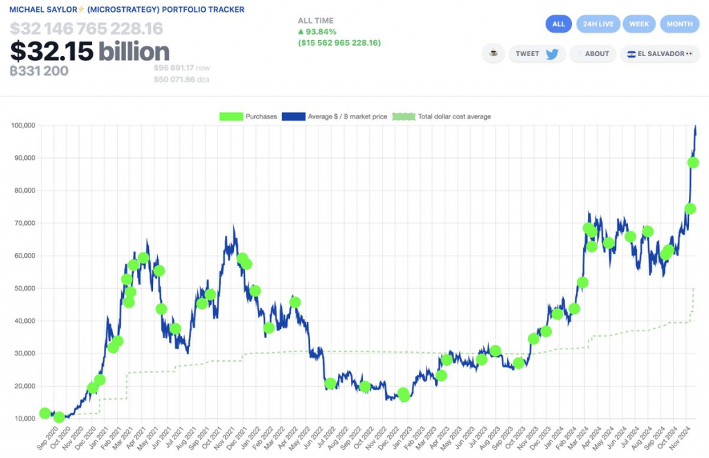 The latest acquisition of 55,500 Bitcoin took place between November 18 and November 24, 2024, with a total investment of $5.4 billion. This translates to an average purchase price of about $97,862 per Bitcoin, which includes associated transaction fees.