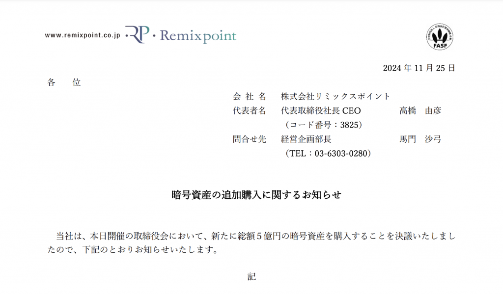 Remixpoint’s Bitcoin Acquisition Plans