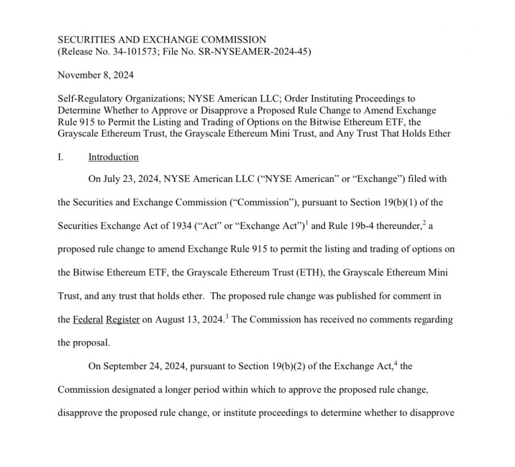 The SEC has delayed its decision regarding the NYSE’s application for options on Ethereum Spot ETFs while it reviews a proposal to amend Exchange Rule 915 for Ether-backed exchange-traded products.