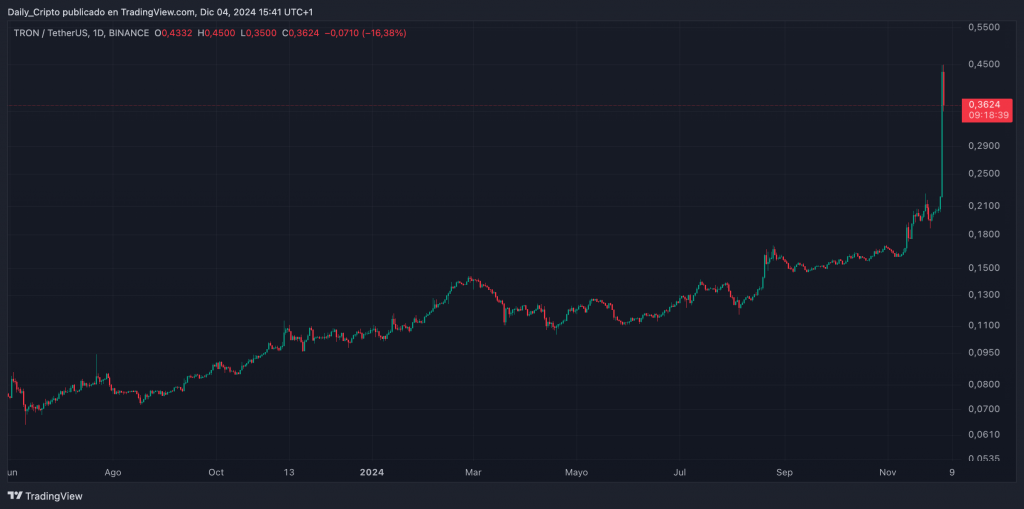 TRON’s native token, TRX, experienced a remarkable price surge, reaching a peak of $0.45, marking its highest value in seven years. This impressive increase was characterized by an 81% rise in a single day, extending to a maximum of a 103%, resulting in a market capitalization that exceeded $35.1 billion. The surge occurred on December 4, 2024, aligning with a broader trend in the cryptocurrency market where investors began reallocating their funds.