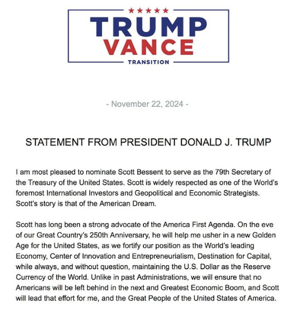 President-elect Donald Trump is allegedly going to nominate Scott Bessent, a pro-crypto hedge fund manager, to serve as Treasury Secretary, overseeing fiscal policies and managing relationships with global finance ministers amidst proposed tariffs.