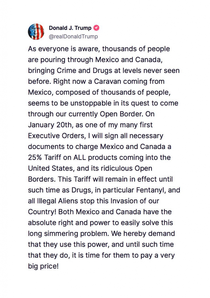 On January 20, President-Elect Trump will implement a 25% tariff on all products imported from Canada and Mexico. This decision is driven by concerns over the influx of illegal immigration and drug trafficking, particularly the flow of fentanyl, which has been linked to approximately 100,000 deaths annually in the U.S.