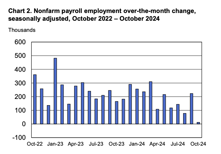 The Bureau of Labor Statistics (BLS) reported a significant slowdown in job creation for October 2024, with only 12,000 jobs added, a stark contrast to the anticipated 113,000. This figure marks the lowest increase since December 2020.